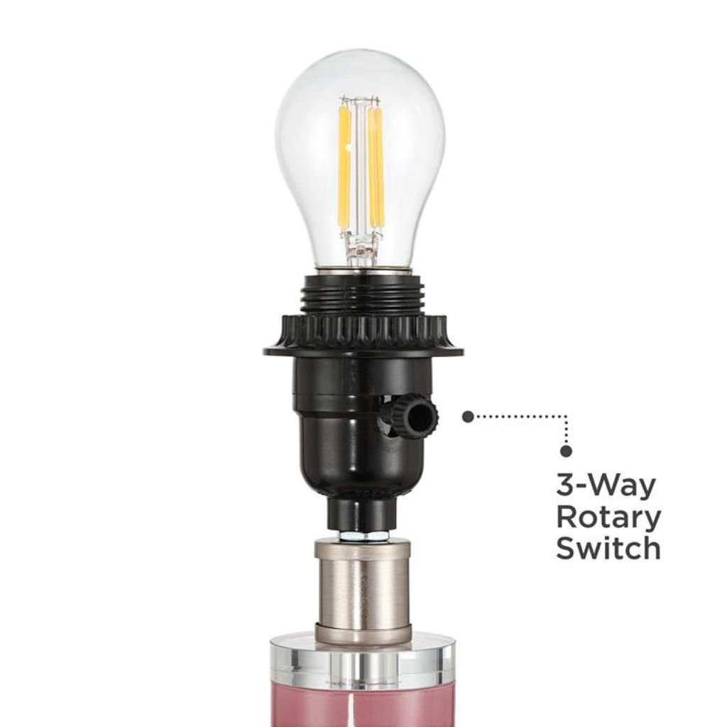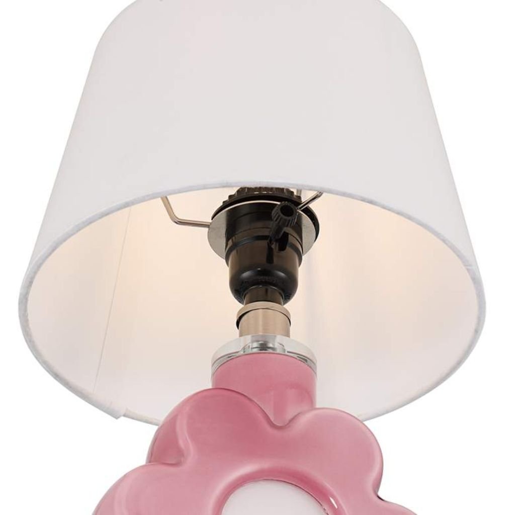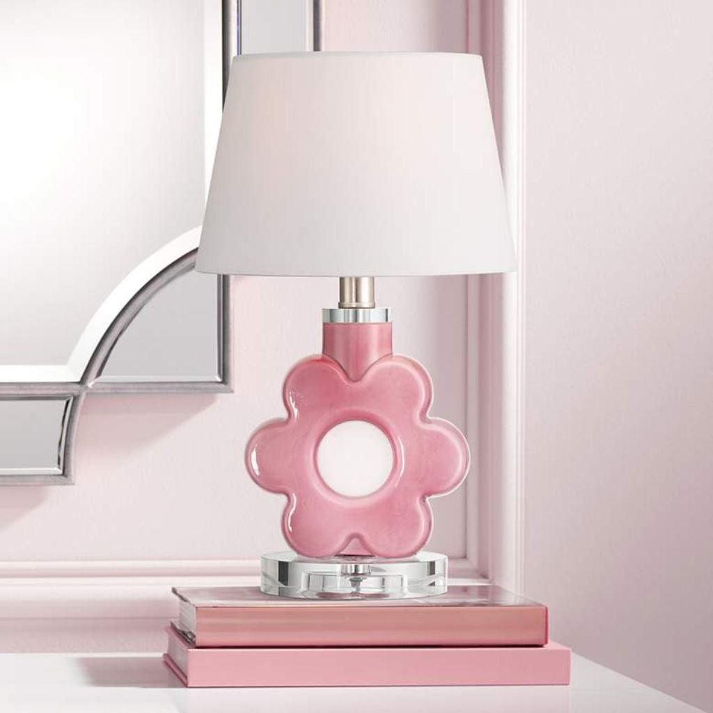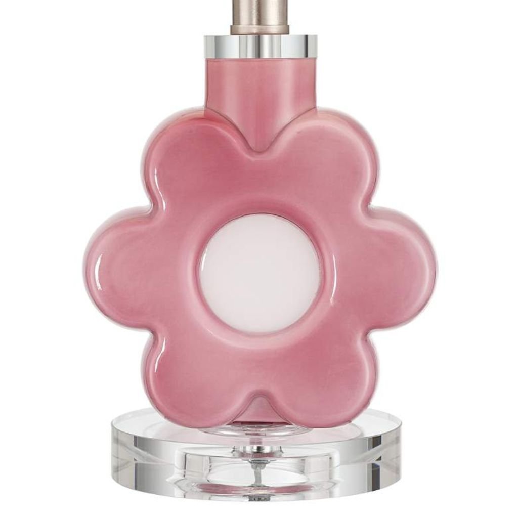The pink flower-shaped base is the centerpiece of this lamp’s design. Soft petal curves and a clear glass foot give it a layered, dimensional quality that catches light beautifully even when the lamp is off. The pink finish is consistent and vibrant without being garish.