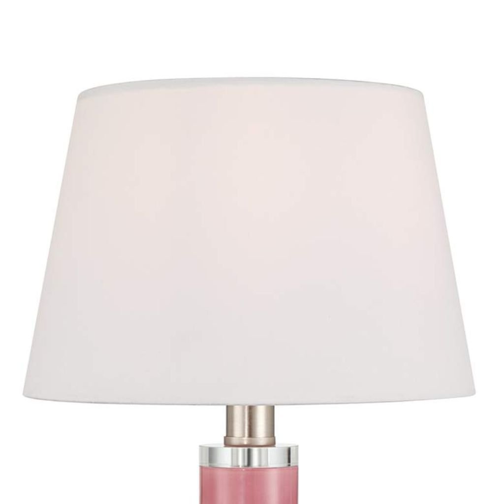 - Materials: Pink glass base, clear glass foot, white fabric empire shade