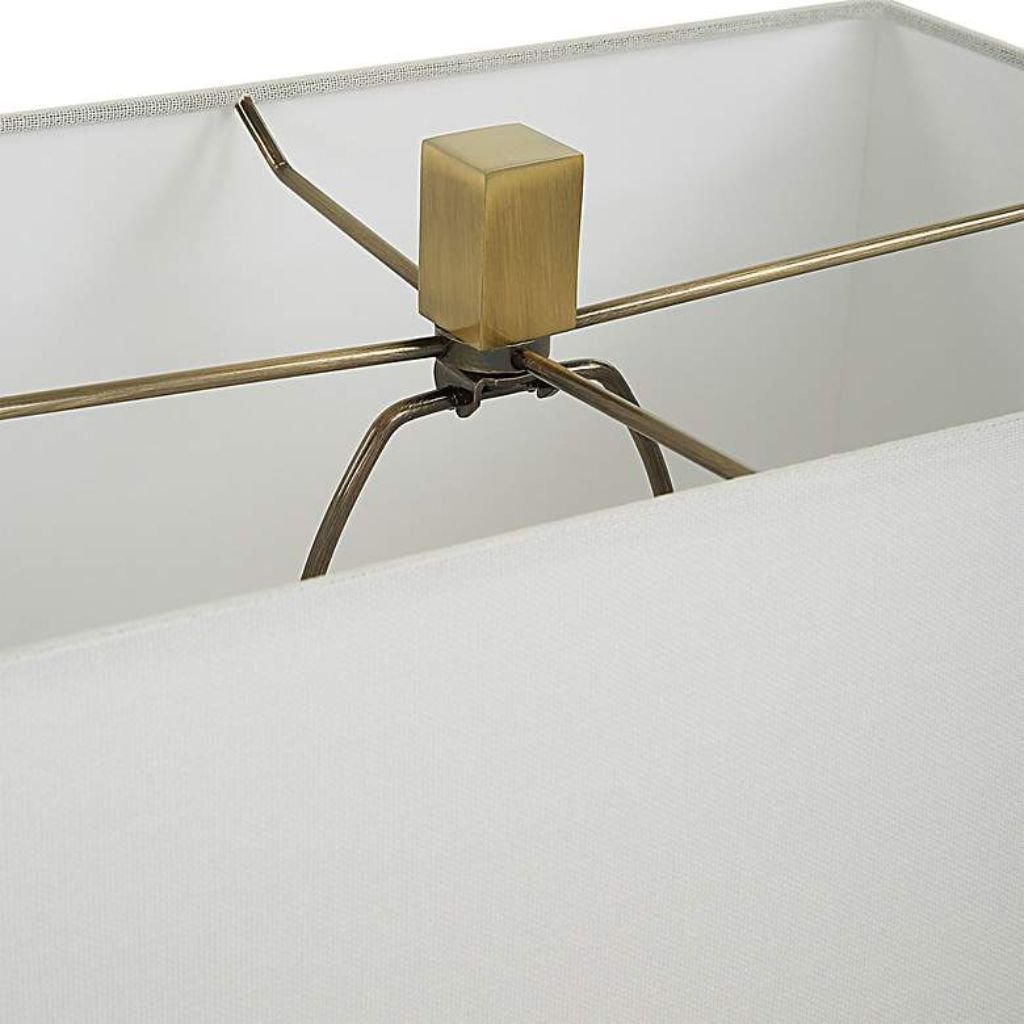 The design highlights a sharp, geometric silhouette with a tapered iron base finished in plated antique brass. A clear crystal ornament adds a touch of glamour and sophistication. The rectangular white linen shade complements the base while diffusing light softly and evenly.