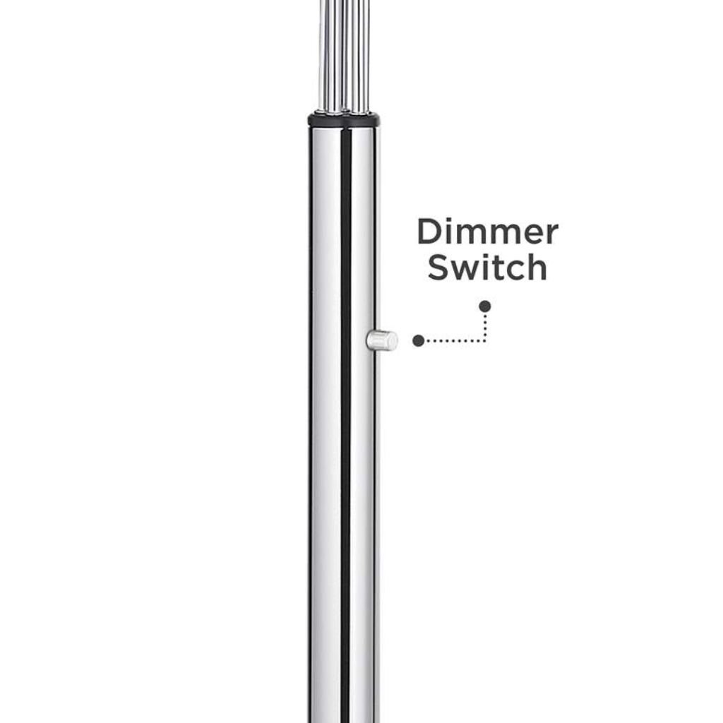 The lamp accommodates five standard medium-base A15 bulbs with a maximum of 40 watts each (bulbs not included). A dimmer switch located on the pole allows simultaneous adjustment of all five lights, enabling control over brightness levels.