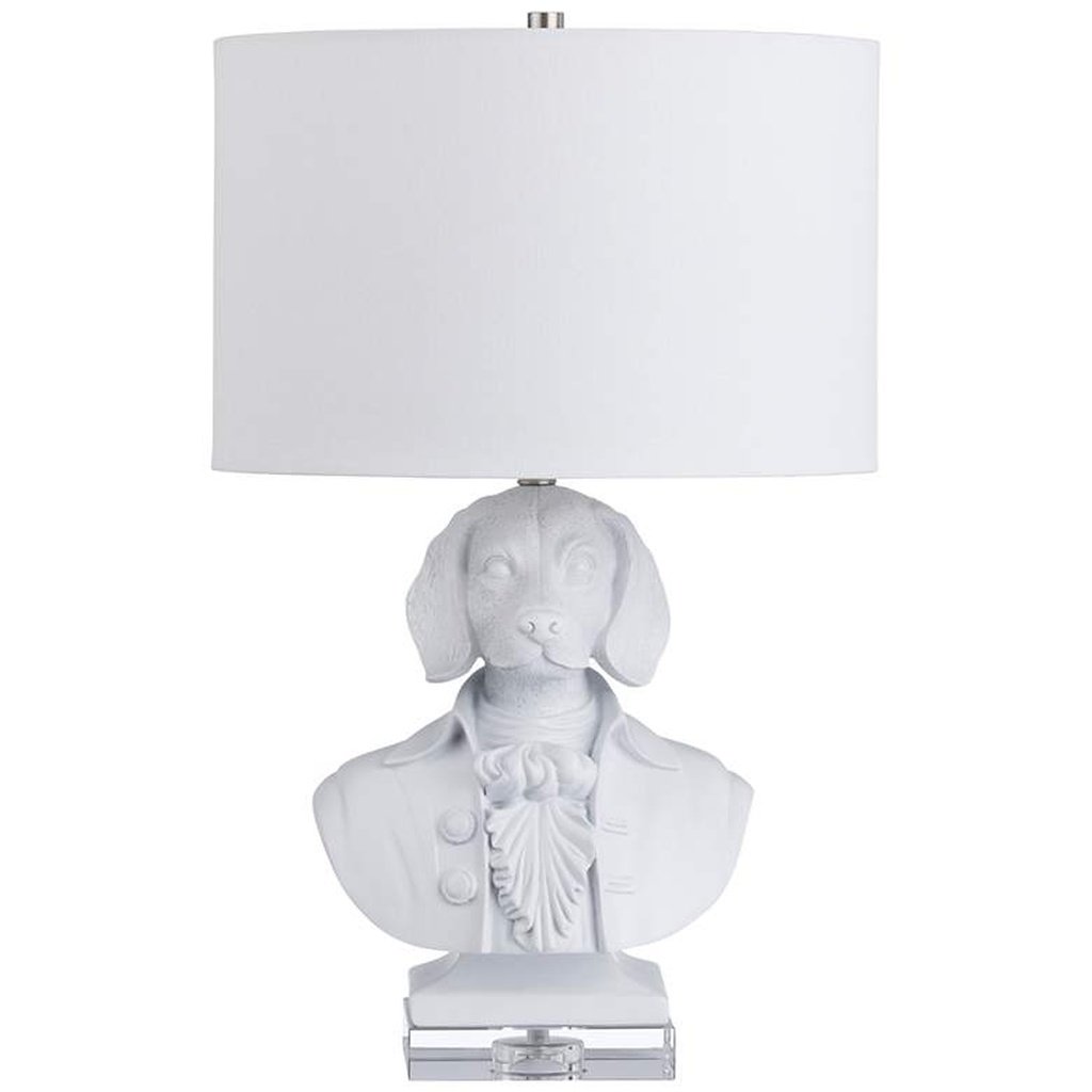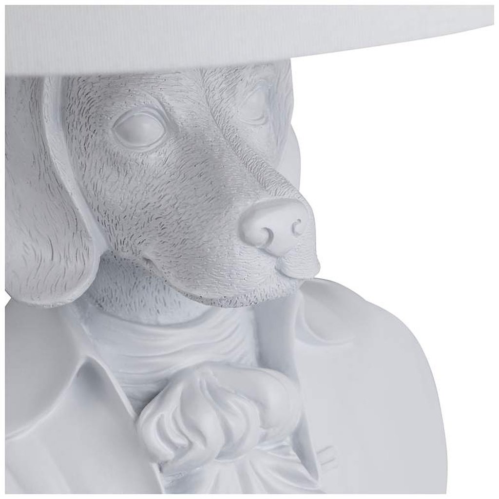 The dog bust base is sculpted with genuine attention to form — the formal attire rendered with enough detail to reward close inspection, the matte white finish giving the resin surface a gallery-quality finish that feels considered rather than costume-like. Crystal accents punctuate the base with subtle brilliance, catching ambient light and adding a decorative counterpoint to the flatness of the matte white. The result is a base that operates simultaneously as sculpture and lamp foundation — neither function compromising the other. At 9.5 inches wide at the base, the footprint is broad and stable, keeping the lamp firmly grounded on side tables and consoles. The crisp white linen shade completes the silhouette with a neutral, tailored finish that allows the base to remain the undisputed focal point.