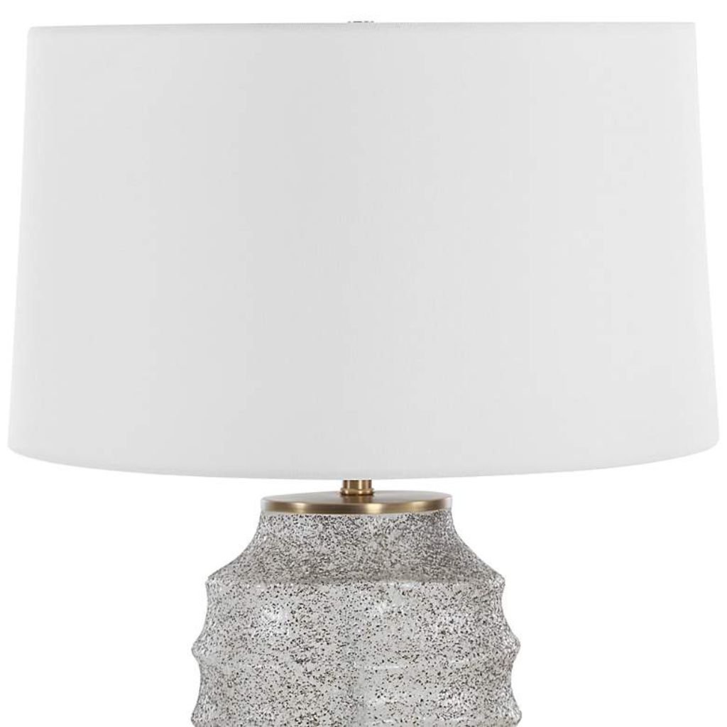 Dark bronze, rust brown, and frosted white — three tones moving through a ribbed glass base in a color story that is warm, earthy, and entirely distinct from the standard ceramic or metal alternatives that dominate the table lamp category. The Acosta ribbed glass table lamp by Uttermost builds its design around the particular quality of ribbed glass construction — a surface treatment that refracts light along each vertical ridge, creating a base that shifts visually as ambient light moves through the room. The tonal layering of dark bronze, rust brown, and frosted white across the glass gives the lamp a depth that single-color glass bases cannot achieve, with each rib catching the warm and cool tones differently depending on viewing angle. Antiqued brass plated details introduce aged metallic warmth at the hardware, and a slightly tapered round hardback shade in white linen fabric completes the composition with clean, neutral diffusion. At 22.3 inches tall, the Acosta suits nightstands, side tables, and accent surfaces where considered material detail matters most.