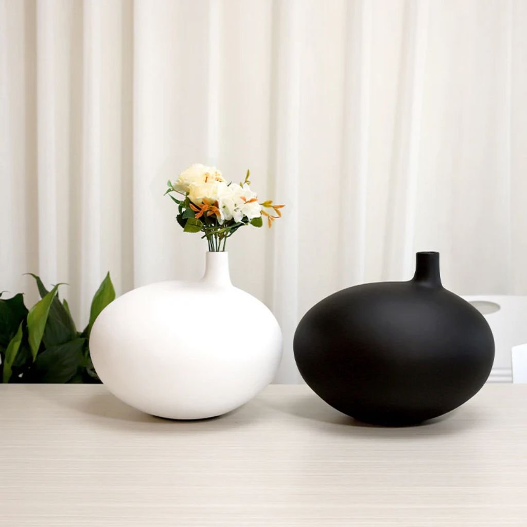 The softly tapered neck and smooth rounded body of this decorative resin vase give it a calm, considered presence that suits both minimalist and layered interior settings. Cast in resin with a refined surface finish, it carries enough visual weight to function as a standalone décor object while remaining versatile enough to support a wide range of floral arrangements.