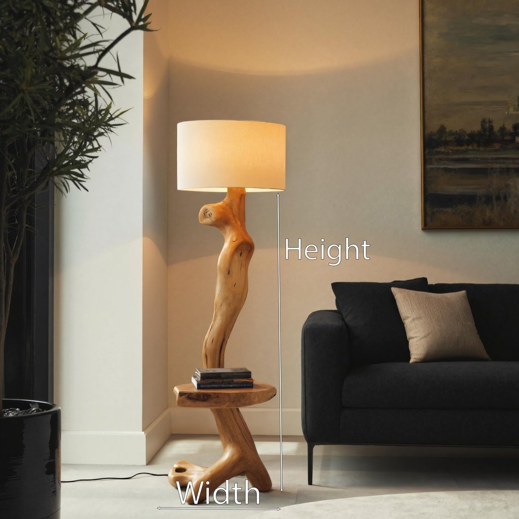 This lamp is all about character. It features a sculptural base crafted from solid wood, showcasing its natural curves and textures. The clever design includes a small side table, which is perfect for resting your book or cup of tea. Topped with a fabric lampshade, this lamp brings rustic charm with a modern twist, ideal for cozy corners or as a statement in your lounge.