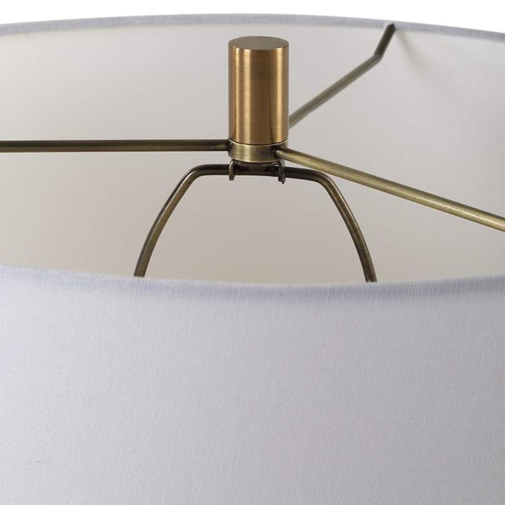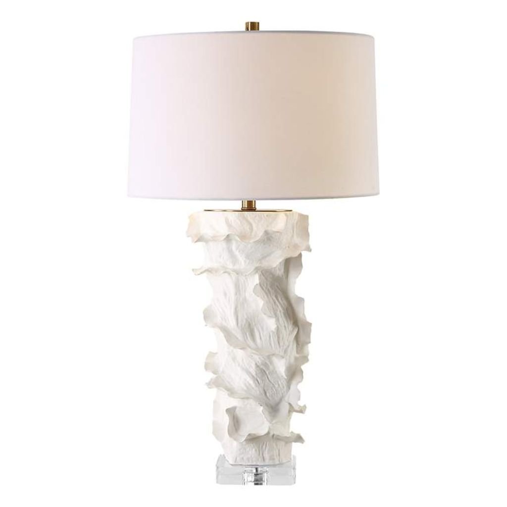 Fiber, ivory, and careful proportion rarely arrive in the same object this convincingly. The sculpture ceramic table lamp from Uttermost’s Wisp collection is built on a ceramic base finished in a satin white glaze — not flat, not glossy, but precisely between the two — with flowing deep ridge details that travel the full length of the form. Those ridges are the design. They catch raking light, create shadow at their valleys, and give the surface a tactile dimension that photography undersells. A thick crystal foot grounds the base with a transparent, refractive accent that separates the ceramic from the surface below it. At 32½ inches tall and nearly 13 pounds, the Wisp is a sculptural object first and a lamp second.