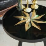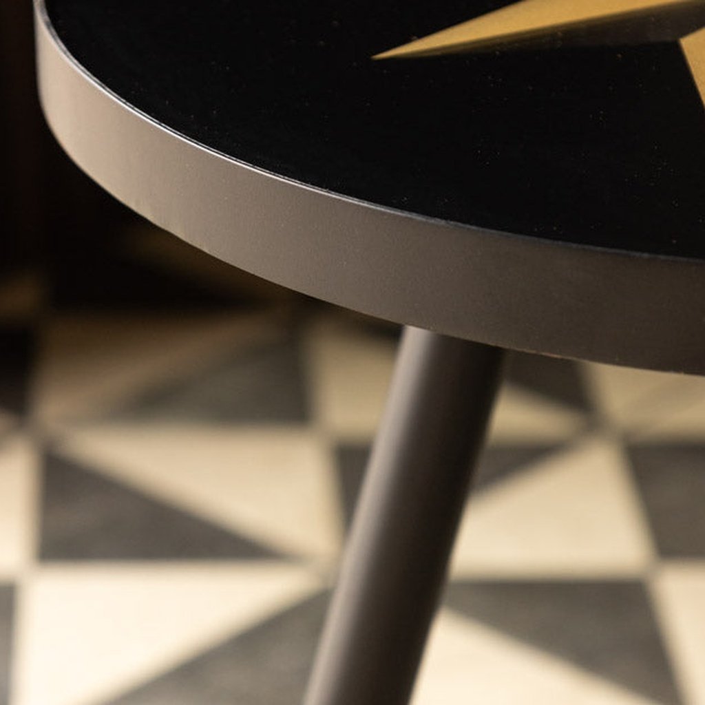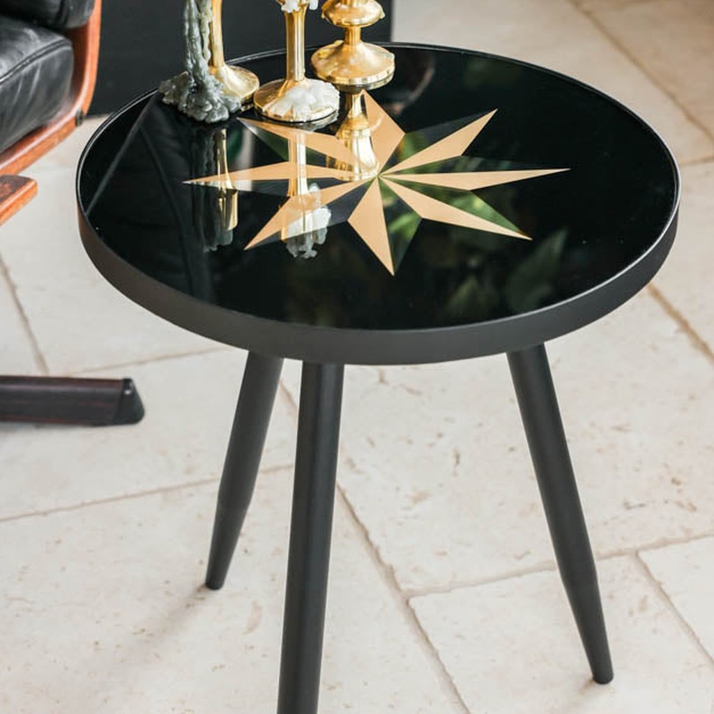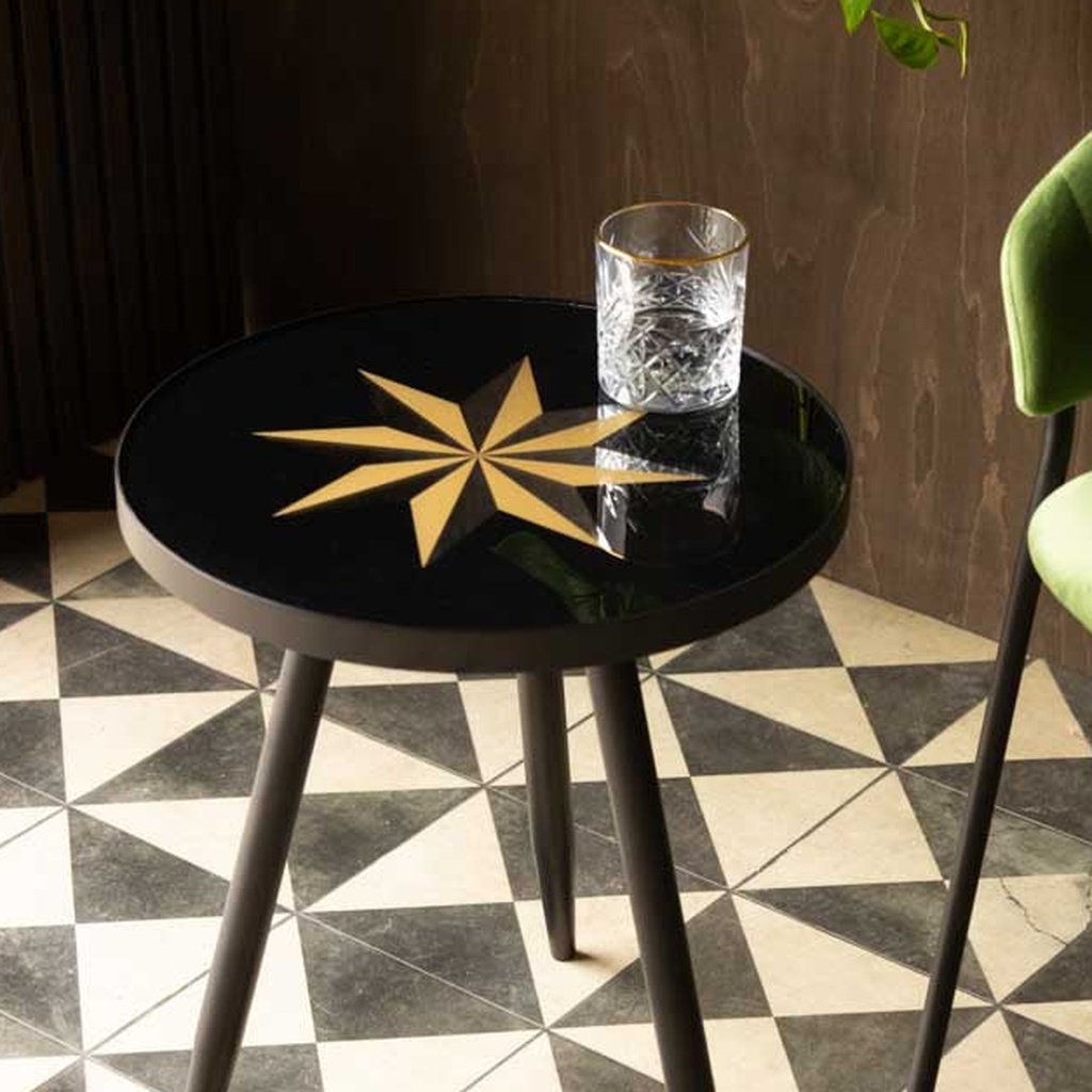 This star side table features a sleek black mirrored top adorned with a shimmering gold and clear star detail for a compact piece with serious glamour. Three sturdy legs keep it stable and open up the base visually, giving it a light, elegant quality. At H47cm x W40cm, it fits neatly into corners and beside sofas without taking over the room.
