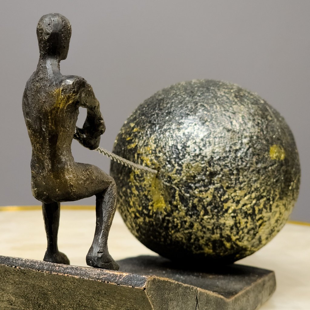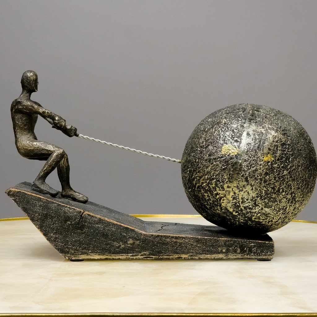 The sculpture features a human figure pulling a large, stone-like sphere up an incline, symbolizing struggle and triumph. The textured bronze finish and rugged base offer a striking look that fits perfectly in modern, industrial, and contemporary settings. Its dynamic design is sure to catch the eye and spark conversation.
