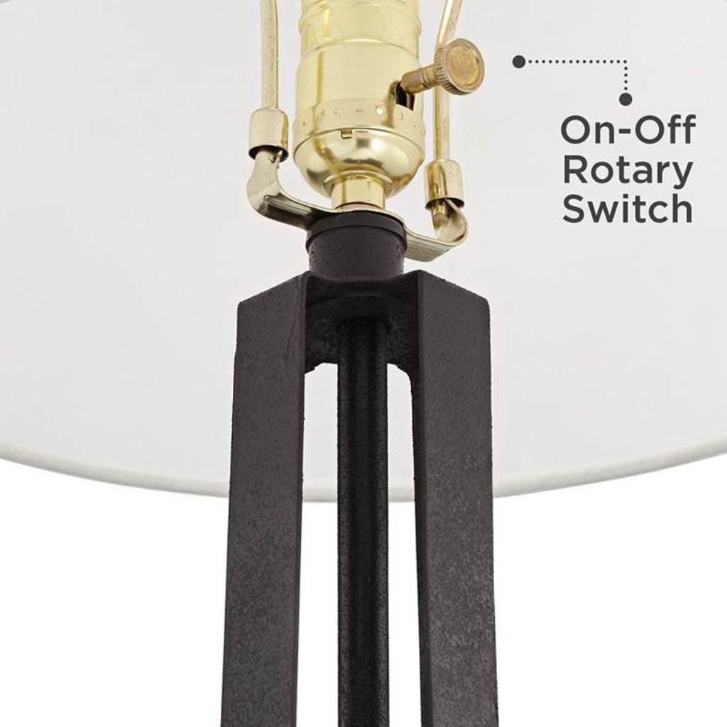 The canvas drum shade diffuses light evenly around its 13 1/2-inch span, casting a warm, pattern-filtered glow that adds visual interest to walls and surrounding surfaces. Rated for up to 150 watts per lamp, the output is generous enough for task and ambient use alike. The on-off switch is located directly on the socket for easy, reach-and-click operation — no searching for a cord switch in the dark.