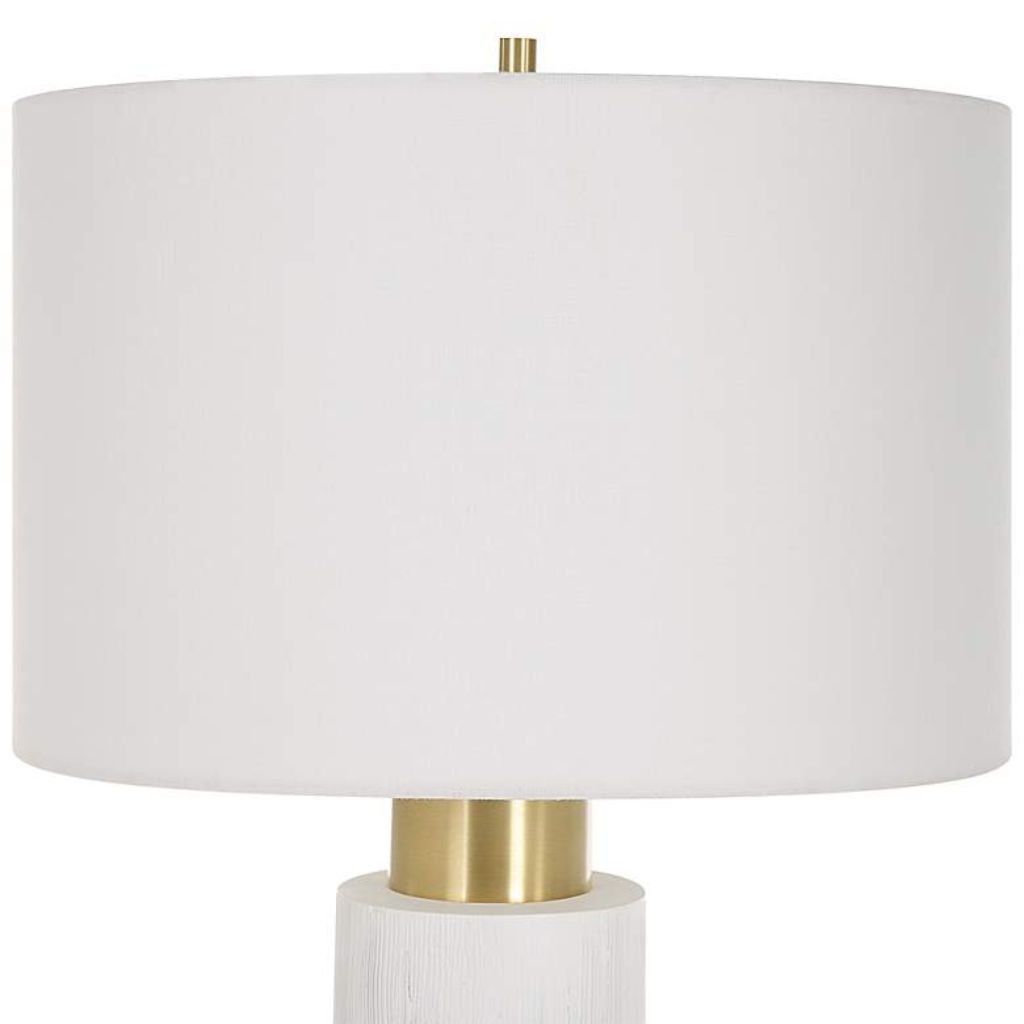 The cylindrical body features a textured white-washed wood finish that introduces warmth and character, while brushed brass-plated iron details add a refined metallic contrast. The crisp white linen drum shade softens the light, creating a warm and inviting ambiance.