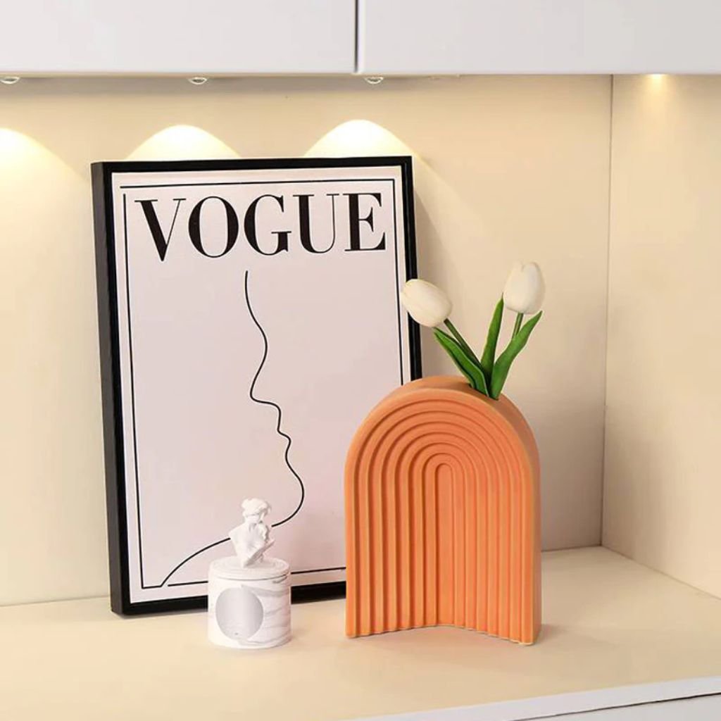 Built from handcrafted ceramic, this statement vase features a series of concentric inverted U-shaped arcs stacked in a vibrant orange finish that immediately reads as sun-inspired and energetic. The smooth matte surface keeps the focus on the rhythmic relief patterning, which adds genuine depth and visual movement to an otherwise clean silhouette. It works as a bold centerpiece or a vivid accent within a curated interior arrangement.