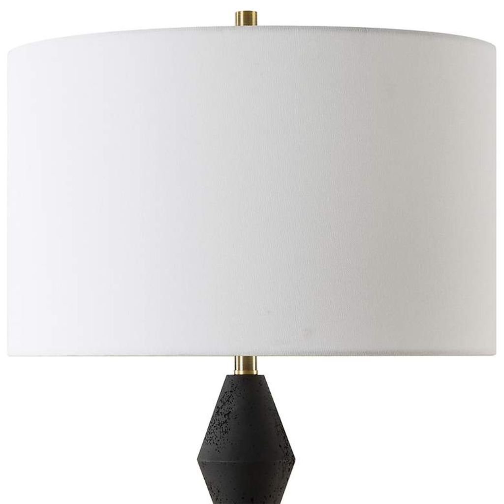 • Color/Finish: Matte black pitted stone, antique brass hardware, crisp white linen shade