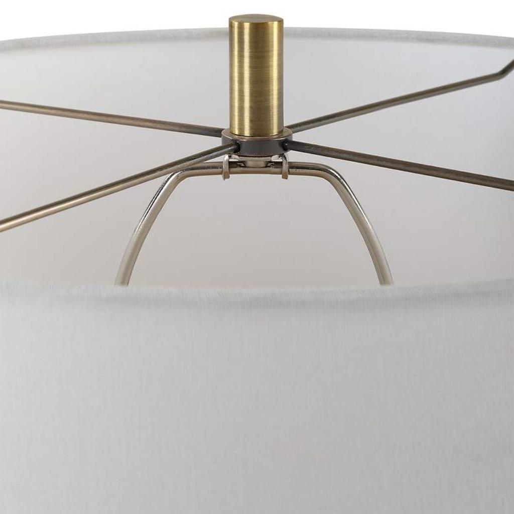 Antique brass plated details accent the lamp’s hardware and transitions, offering a warm metallic contrast against the dark stone base. The aged brass tone bridges the gap between the raw, industrial character of the stone and the clean white shade above.
