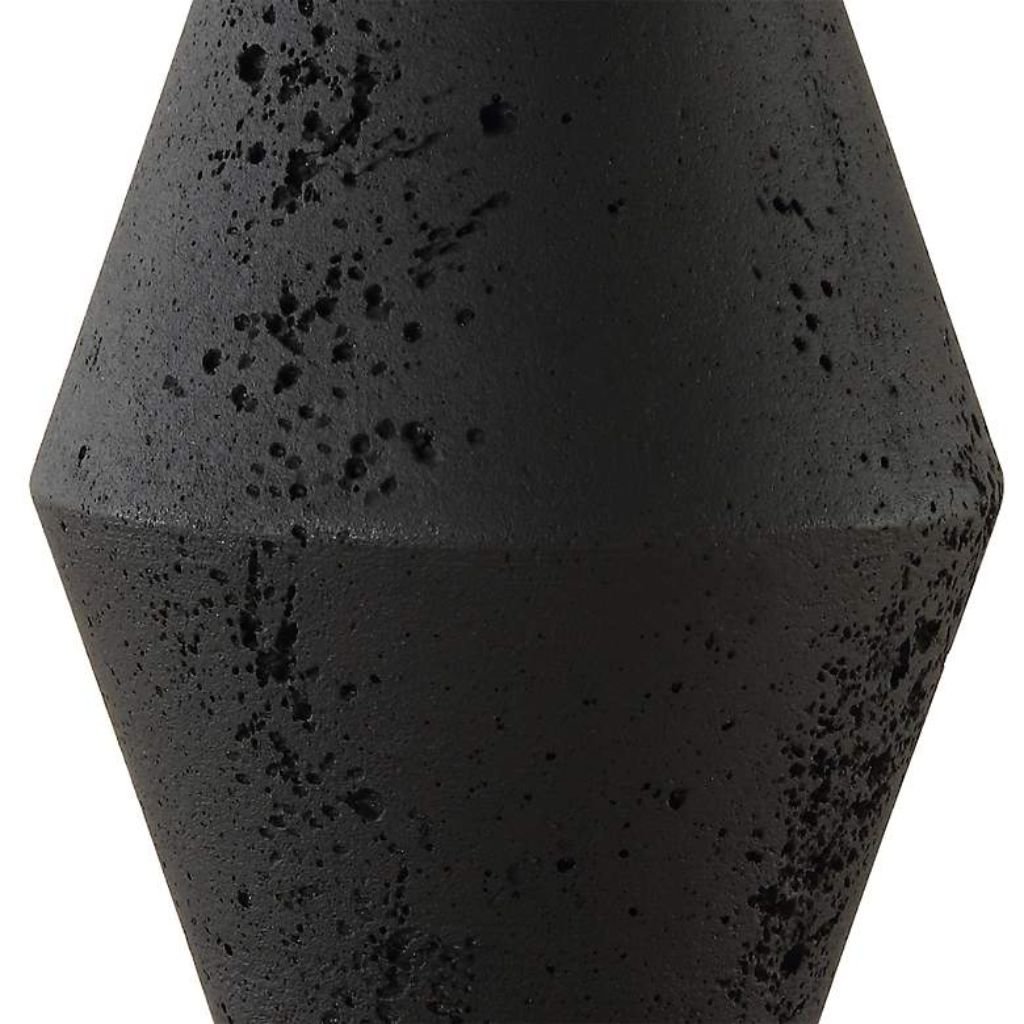 The base is cast from man-made stone in a deep, matte black finish with a pitted surface that creates genuine tactile and visual texture. The irregular pitting catches light and shadow differently from every angle, giving the lamp a dynamic quality that smooth or glazed finishes simply can’t replicate.