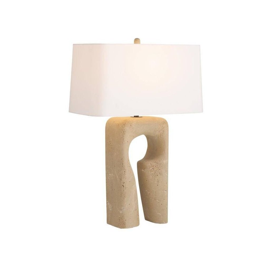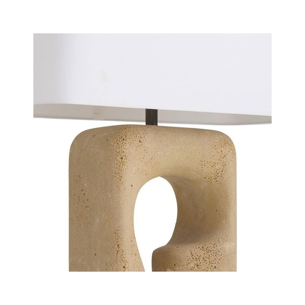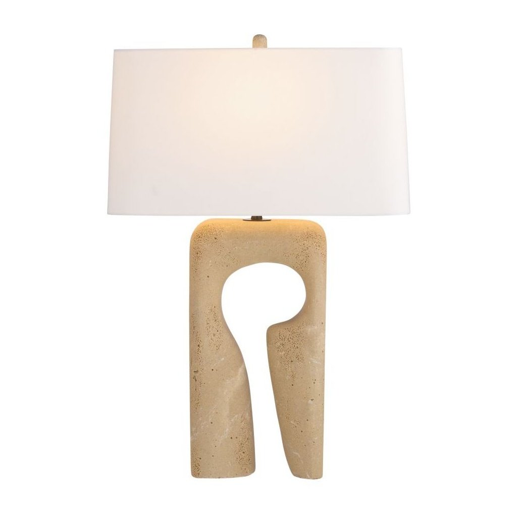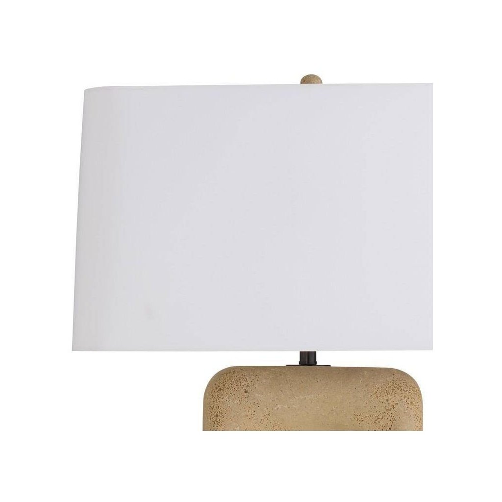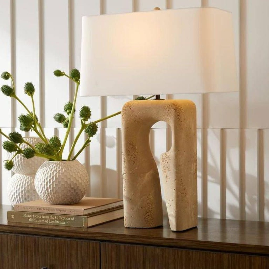 Travertine brings a naturally pitted, earthy texture to this lamp base, offering the look of real stone with a warm, sandy palette. The material complements both contemporary and organic interior styles.