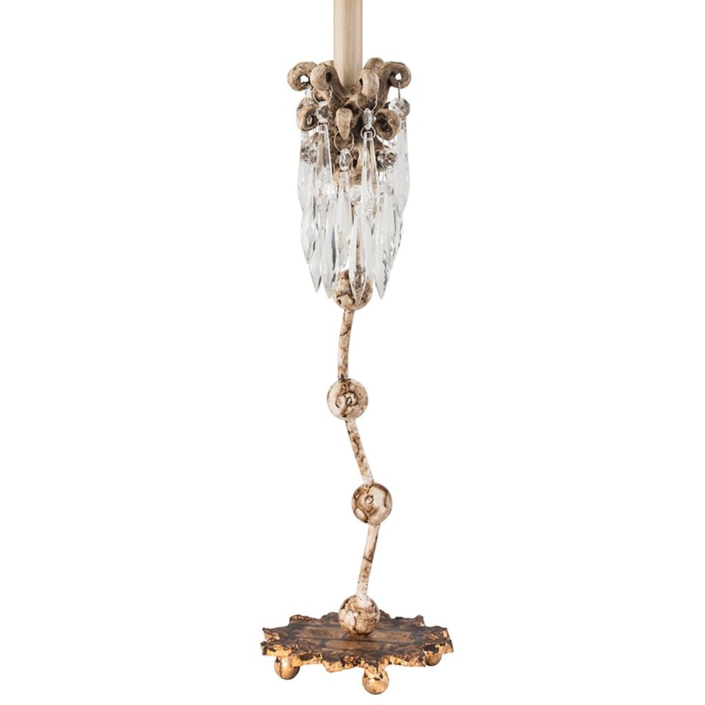 • Materials: Hand-painted beige patina finish over steel frame. Cut-glass crystal accents. Distressed gold leaf base.