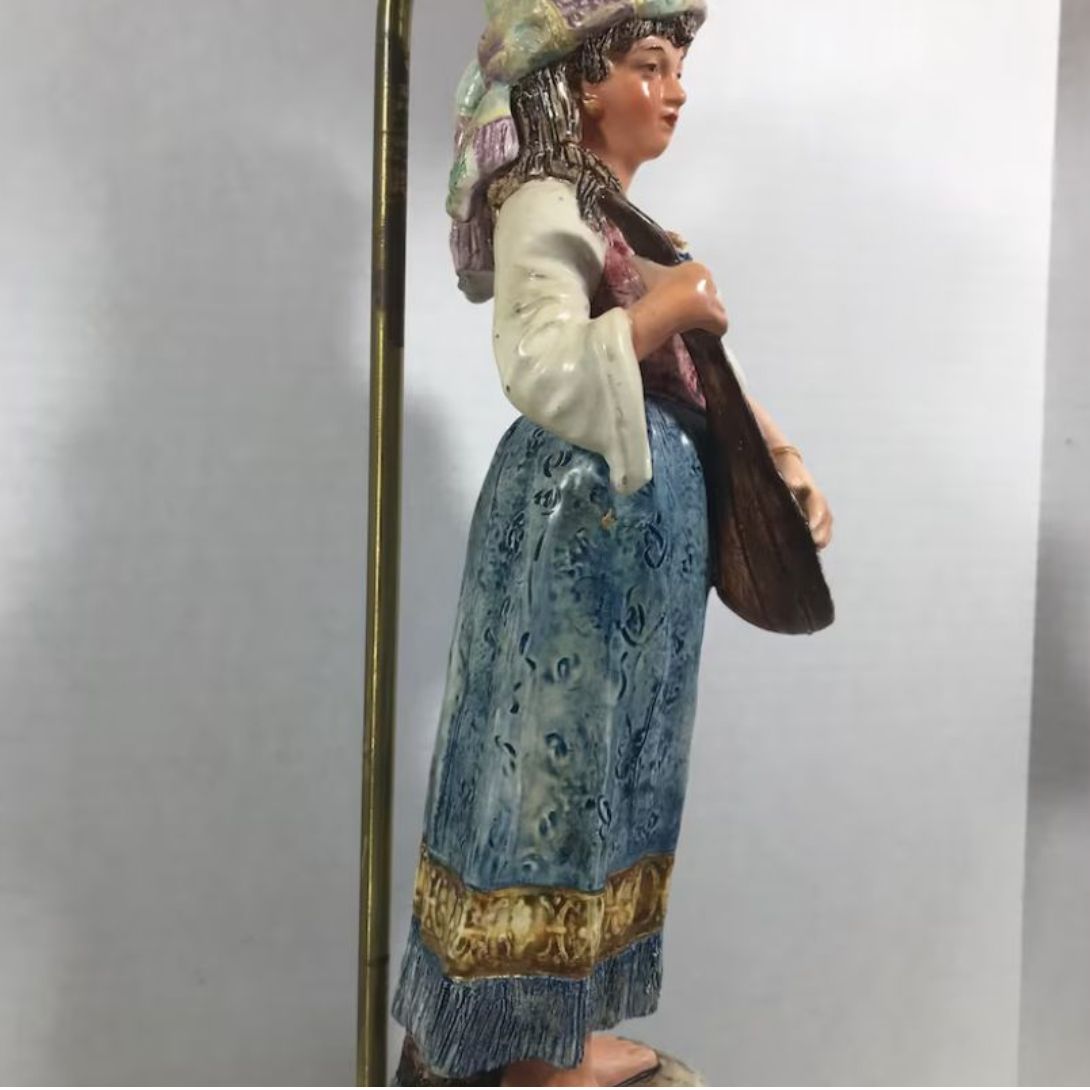 Add a touch of old-world charm to your home with this vintage ceramic figural lamp featuring a Renaissance-inspired gypsy lady. Standing gracefully atop a wooden base, the lamp showcases a beautifully detailed ceramic statue of a peasant lady in traditional attire. The brass tube behind her supports the light portion of the lamp, giving it an elegant and functional design.