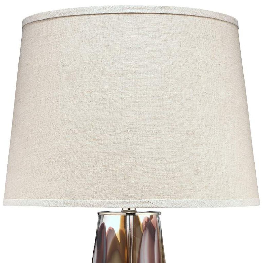 Silver finish hardware runs through the lamp’s fittings, providing a refined contrast against the warm tones of the glass body. The pairing keeps the overall look from feeling too warm or heavy, giving it a balanced quality that works across a range of interior color palettes.