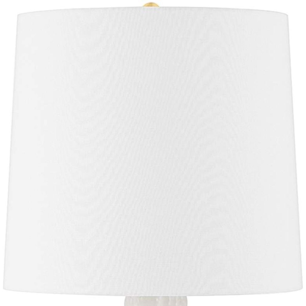 The neutral linen shade balances the lustrous alabaster base, creating a warm, inviting glow.