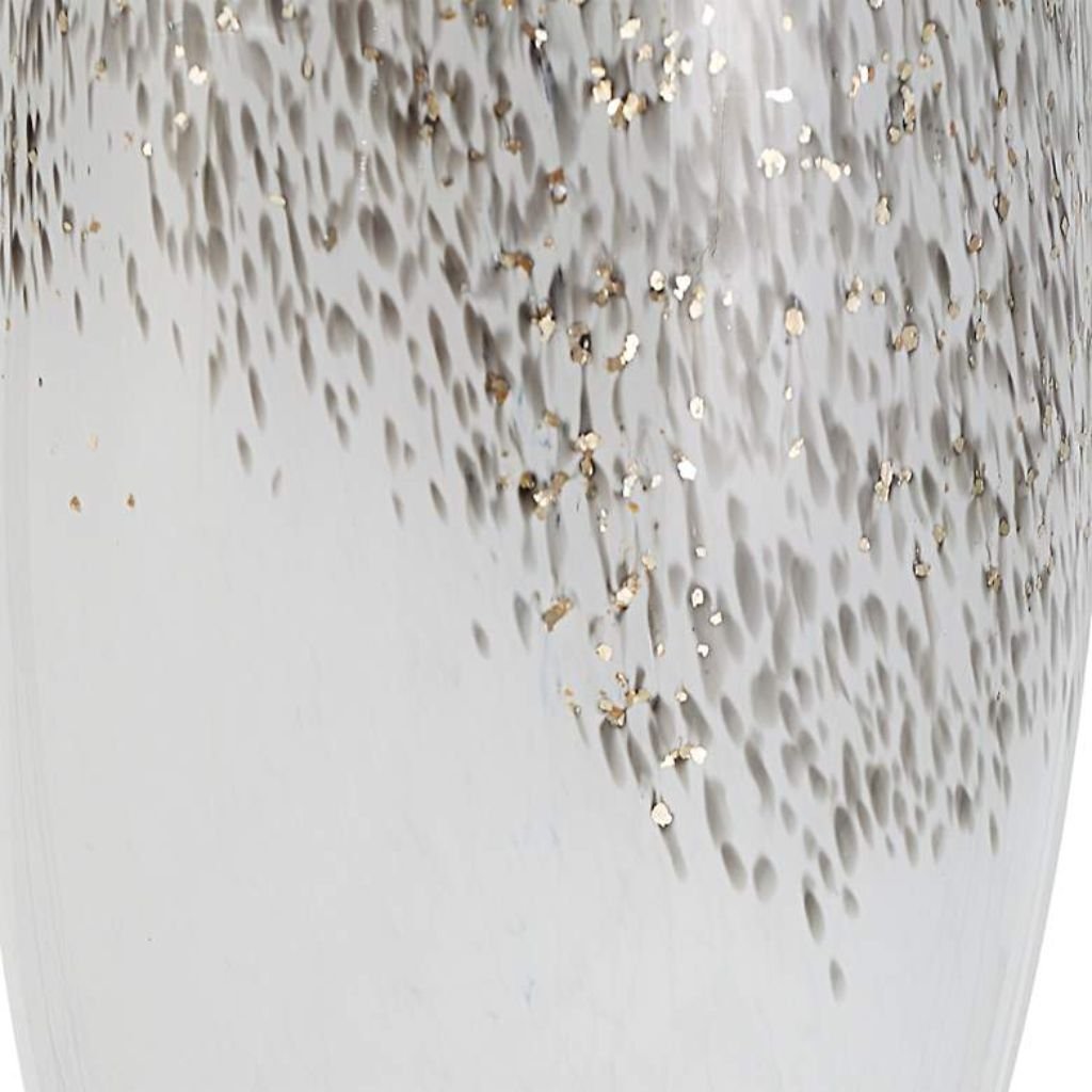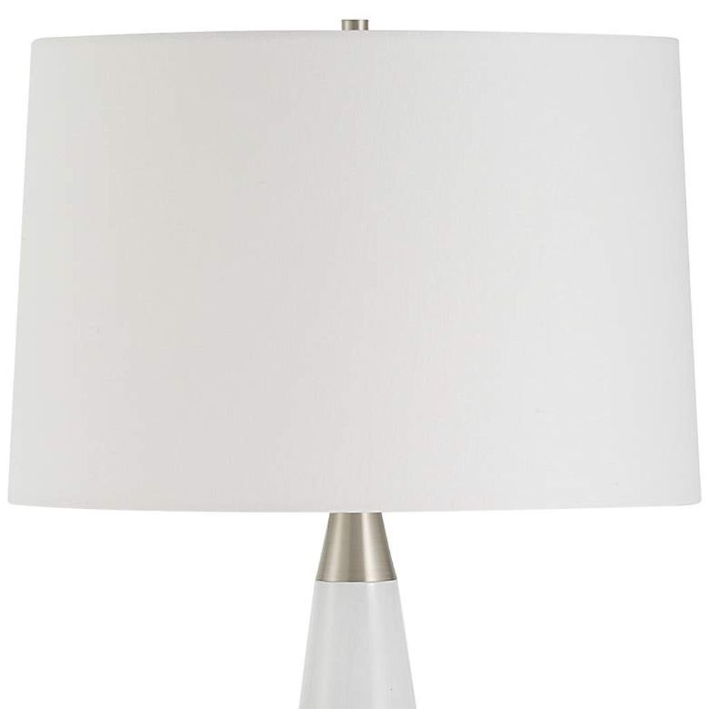 Standing 28 3/4 inches tall with a 5-inch-wide base, the Quinn lamp features a slender glass construction. Its striking white background is accented with mottled gray patterns and metallic silver highlights, creating a sophisticated visual effect. The base rests on a thick crystal foot with plated brushed nickel accents, adding shimmer and luxury to the design.
