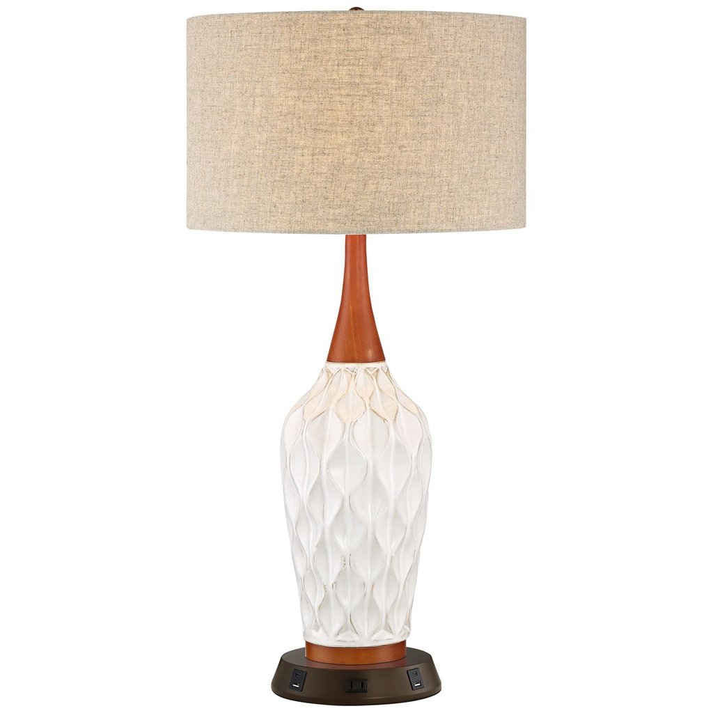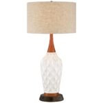 • Color/Finish: Mid-Century Modern ceramic table lamp from the 360 Lighting brand. White finish ceramic body with a decorative geometric pattern.