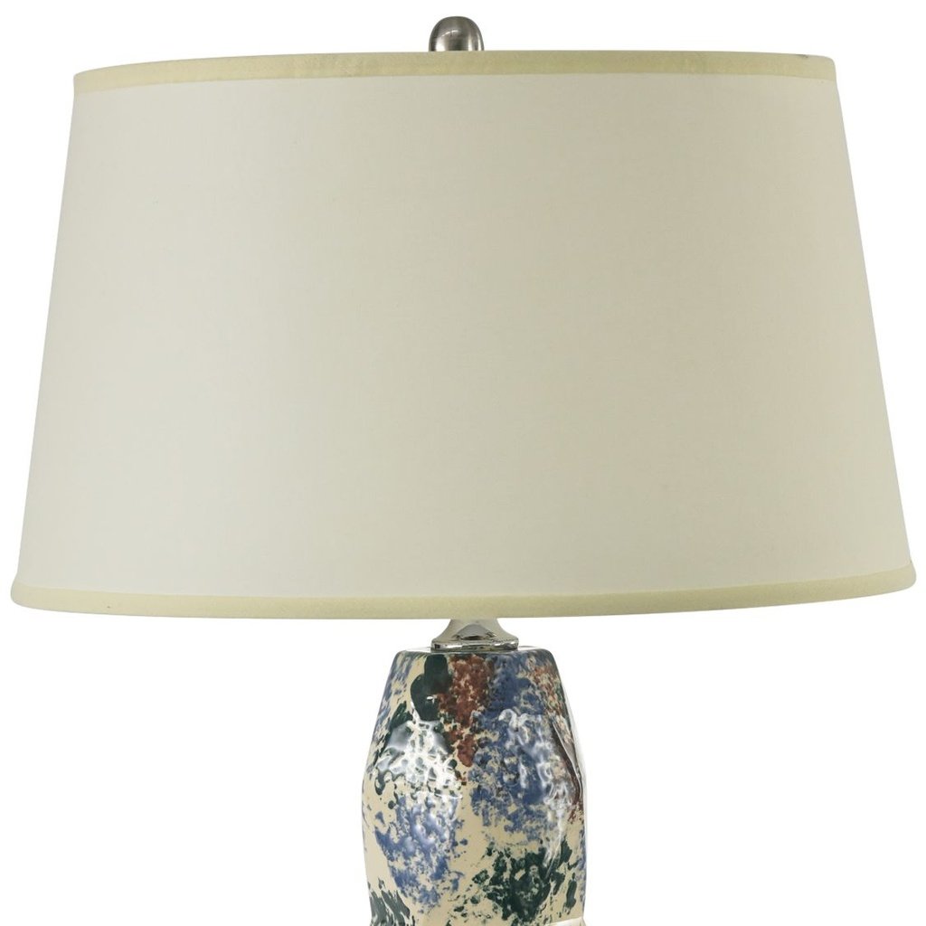 • Color/Finish: White confetti glaze finish over ceramic construction. Parchment linen drum shade.