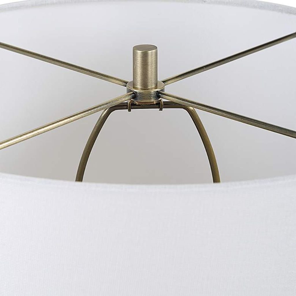Graceful, flowing, and finished in a white tone-on-tone textured glaze that reveals its complexity only under close inspection — the Liora white porcelain table lamp by Uttermost is a study in surface refinement over decorative restraint. The porcelain base rises in a flowing silhouette that moves with organic, unhurried grace — no sharp angles, no abrupt transitions, just continuous curvature from base to neck. The tone-on-tone textured glaze is what gives the white surface its depth — pattern and ground share the same color but differ in surface quality, creating a visual texture that registers as subtle from across the room and genuinely refined up close. Brushed antique plated brass accents introduce warm metallic counterpoint at the hardware, preventing the lamp’s white and white composition from reading as cold or clinical. A white linen fabric shade completes the lamp with the clean, neutral diffusion its porcelain base deserves. At 26.3 inches tall and just 5.5 pounds, the Liora brings sophisticated material delicacy to any surface it occupies.