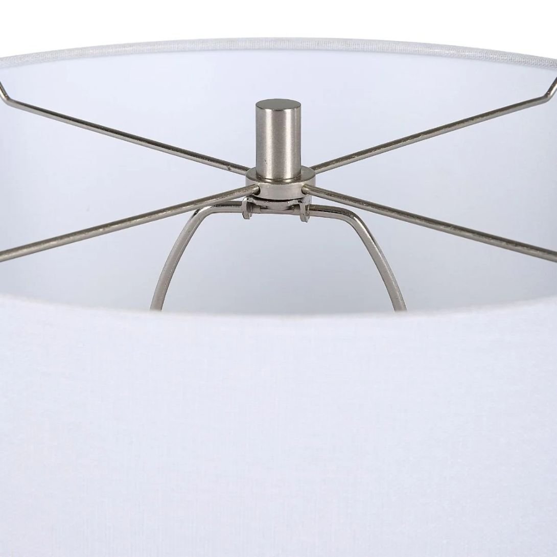 Accented with brushed nickel hardware, the design introduces a modern edge that complements its organic feel. Topped with a slightly tapered white linen shade, the lamp emits a soft, inviting glow, creating a warm and serene atmosphere in any room.